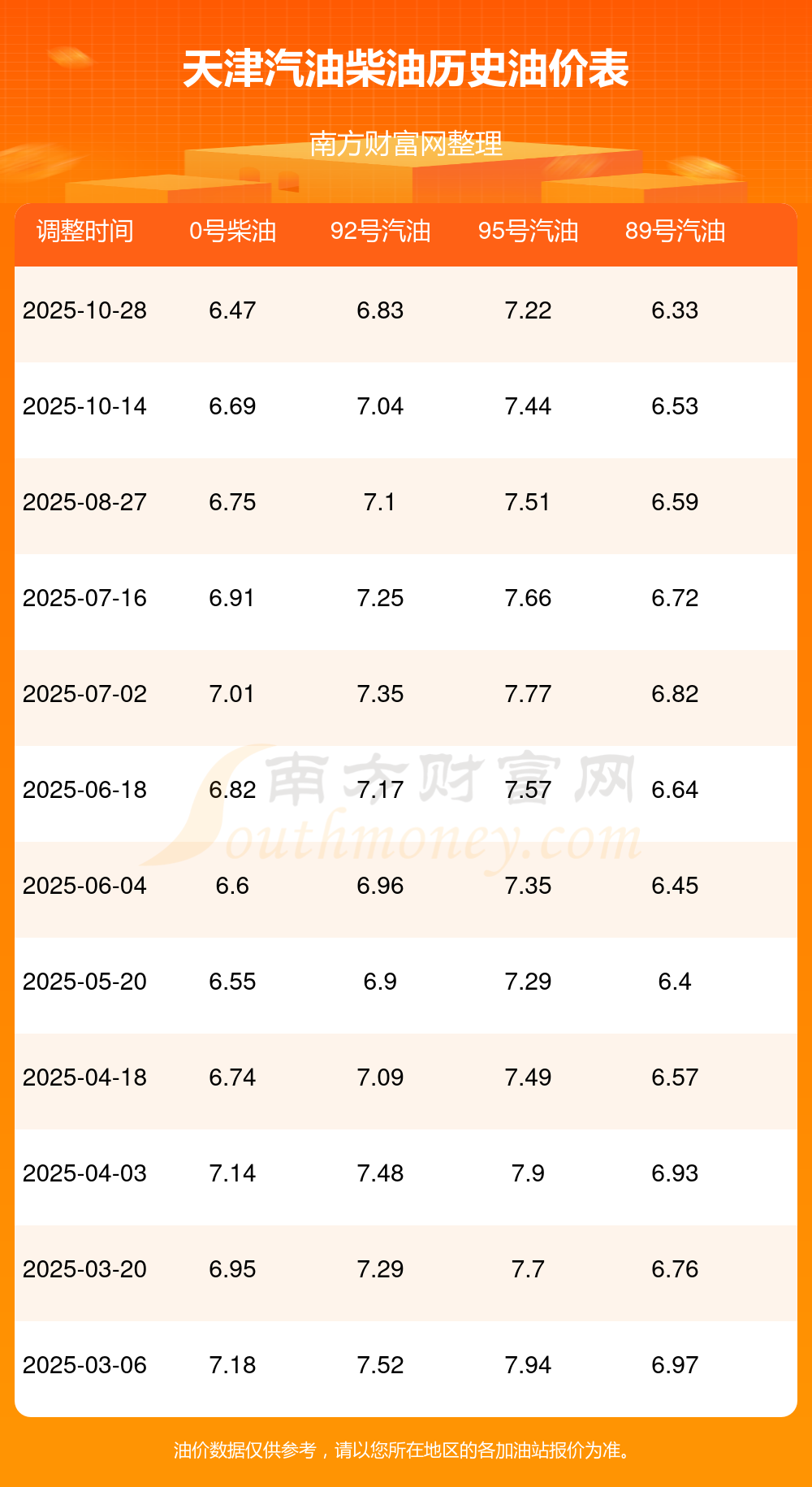 11月9日天津汽油、柴油每升的價格為:92號汽油為6.83元,跌了0.21元;95號汽油為7.22元,跌了0.22元;89號汽油為6.33元,跌了0.2元;0號柴油為6.47元,跌了0.22元,本輪油價的調(diào)整時間為10月28日。