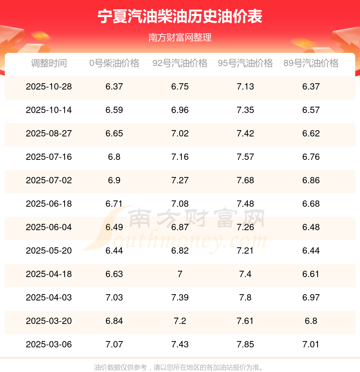 11月9日,寧夏92號(hào)汽油的價(jià)格是6.75元每升,本次的調(diào)整時(shí)間為10月28日,對(duì)比上次的調(diào)整下降了0.21元,下降3.017%,11月10日24時(shí)為下一輪油價(jià)調(diào)整時(shí)間,還有1.42天。
