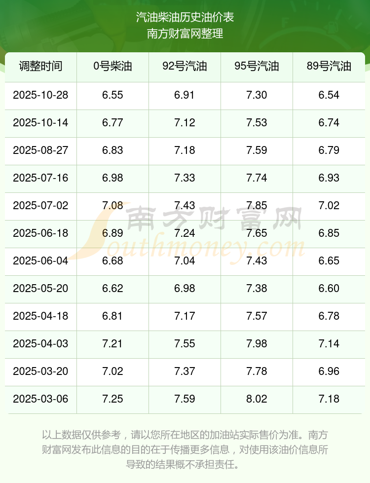 11月9日綦江汽油柴油每升的價格為10月28日調(diào)整后的價格,具體如下:92號汽油6.91元;95號汽油7.3元;89號汽油6.54元;0號柴油6.55元。下一輪油價調(diào)整時間11月10日24時,距離現(xiàn)在還有1.42天。