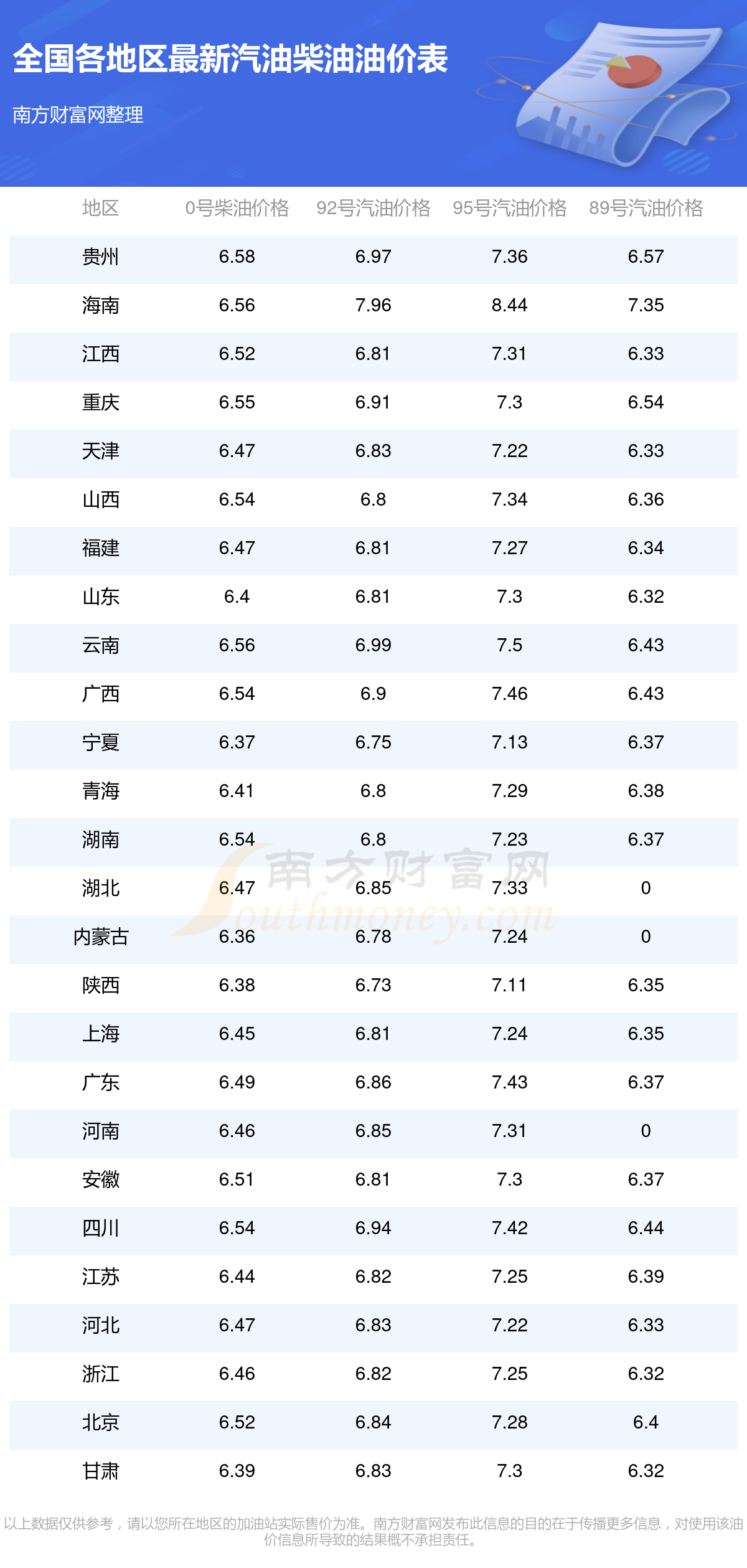 2025年11月9日全國各地油價調(diào)整及最新汽油價格表