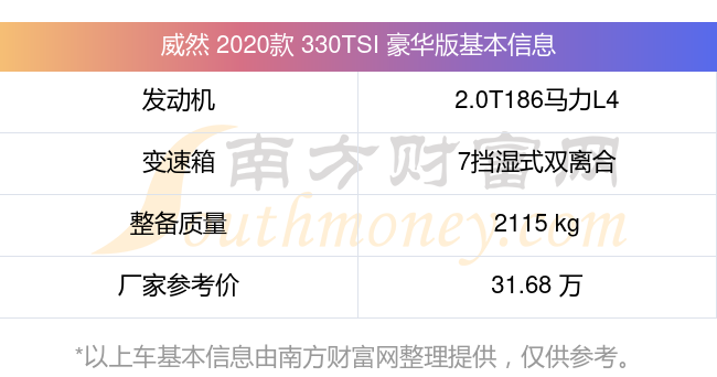 在動力方面,威然 2020款 330TSI 豪華版搭載的是一臺2.0T186馬力L4渦輪增壓發(fā)動機,匹配7擋濕式雙離合自動檔變速箱,燃料形式為汽油,常規(guī)整備質(zhì)量2115kg,廠家參考價31.68萬元。