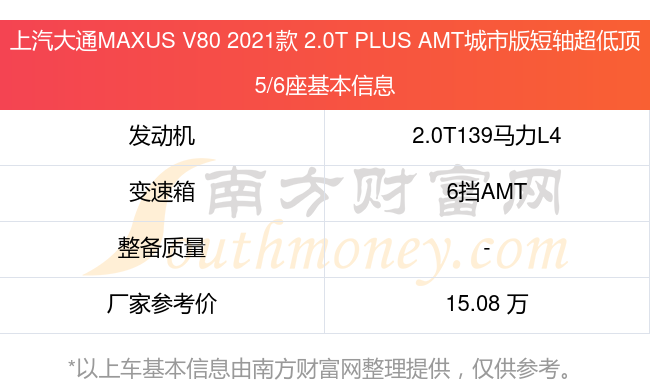 上汽大通MAXUS V80 2021款 2.0T PLUS AMT城市版短軸超低頂5/6座動力上配備的是一臺2.0T139馬力L4渦輪增壓發(fā)動機,匹配的是6擋AMT自動檔變速箱,燃料形式為柴油,廠家參考價15.08萬元。