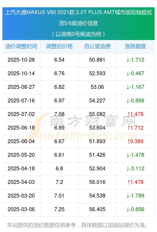 按10月28日0號柴油最新調整價格6.54元每升來計算(以湖南為例),該車型百公里平均油費為50.881元,按上一輪10月14日調整價格6.76元每升來計算,百公里平均油費為52.593元,對比上一輪少花1.712元,下一輪油價調整時間為11月10日24時。