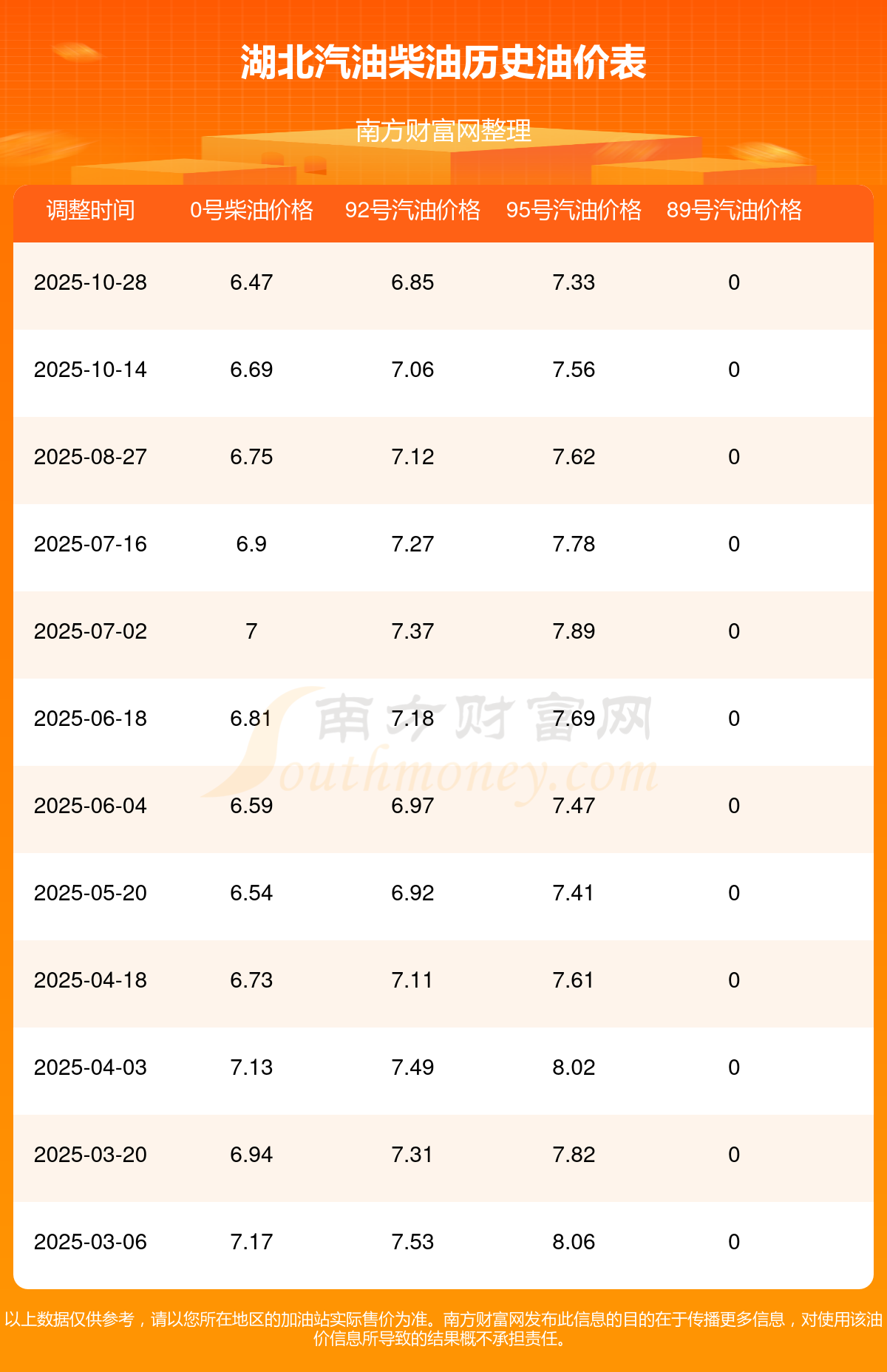 11月9日湖北汽油、柴油的最新價格是10月28日調(diào)整后的價格,具體為92號汽油6.85元,降了0.21元,降幅達2.98%;95號汽油7.33元,降了0.23元,降幅達3.04%;0號柴油6.47元,降了0.22元,降幅達3.29%。
