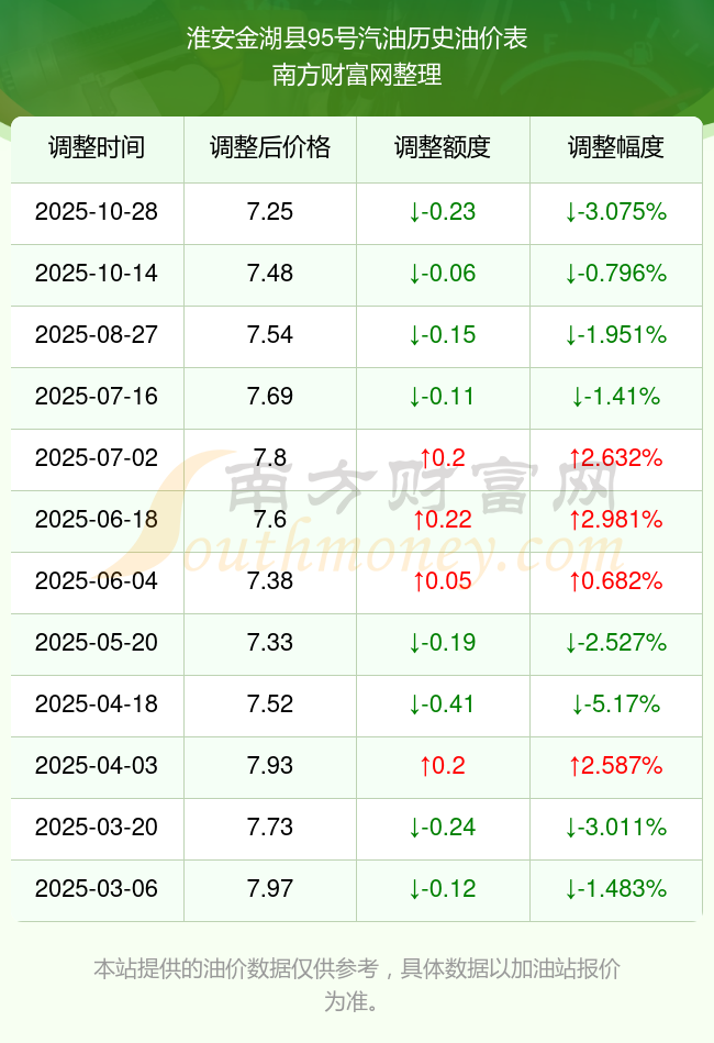 淮安金湖縣11月9日95號汽油歷史油價調(diào)整一覽表