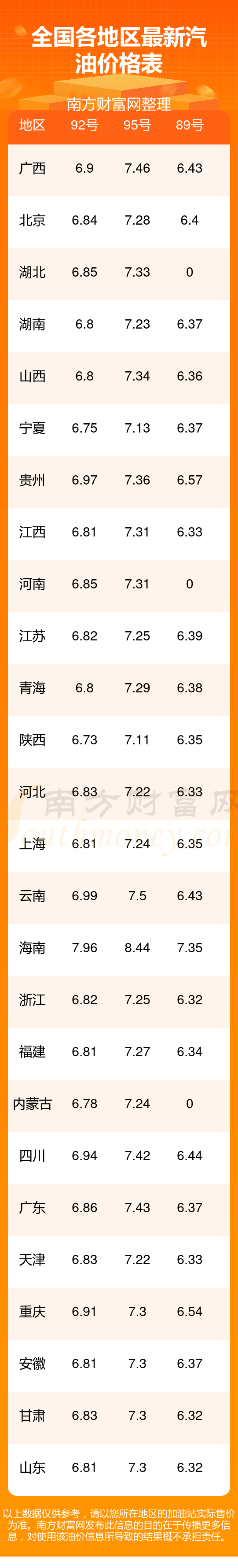 本次油價的調(diào)整時間為10月28日,調(diào)整后全國92號汽油平均價格為7元每升,其中,最低的是陜西,6.73元每升,最高的是海南,7.96元每升。全國95號汽油平均價格為7元每升,其中,最低的是陜西,7.11元每升,最高的是海南,8.44元每升。全國0號柴油平均價格為:6元每升,其中,最低的是內(nèi)蒙古,6.36元每升,最高的是貴州,6.58元每升。全國89號汽油平均價格為6元每升,其中,最低的是浙江,6.32元每升,最高的是海南,7.35元每升。,下一輪油價調(diào)整時間11月10日24時,距離現(xiàn)在還有1.38天。