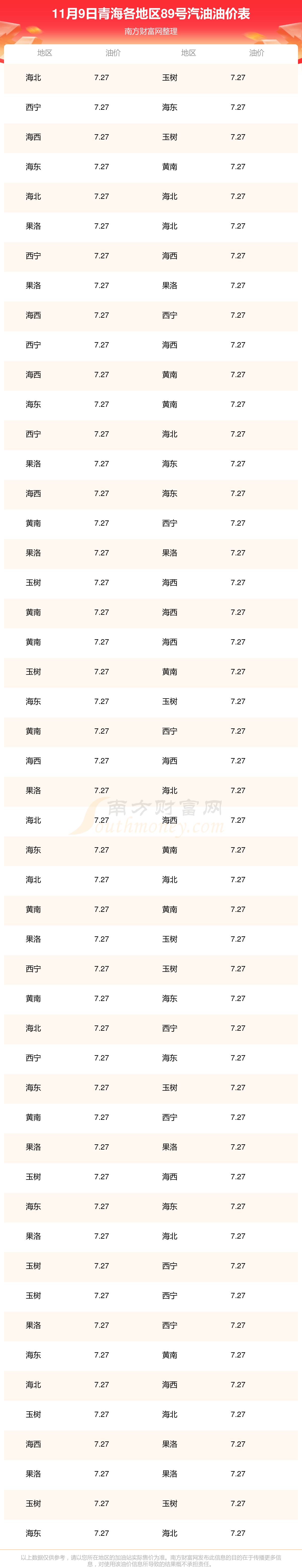 11月9日,青海89號汽油的價格是6.38元每升,本次的調(diào)整時間為10月28日,對比上次的調(diào)整跌了0.2元,跌3.04%,下次調(diào)整時間為11月10日24時,還有1.37天。