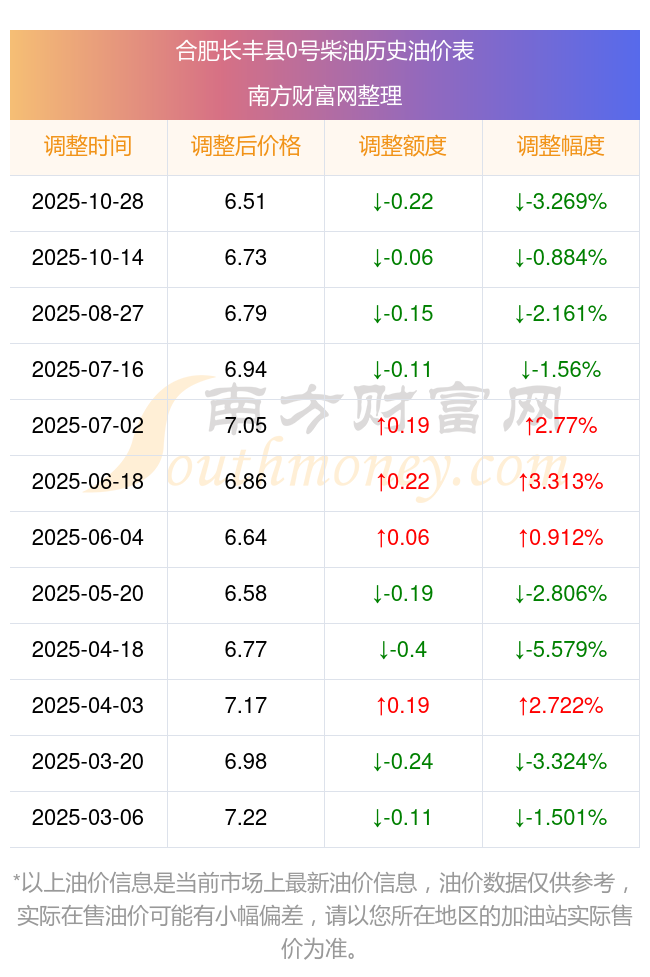 11月9日合肥長(zhǎng)豐縣0號(hào)柴油歷史油價(jià)一覽表