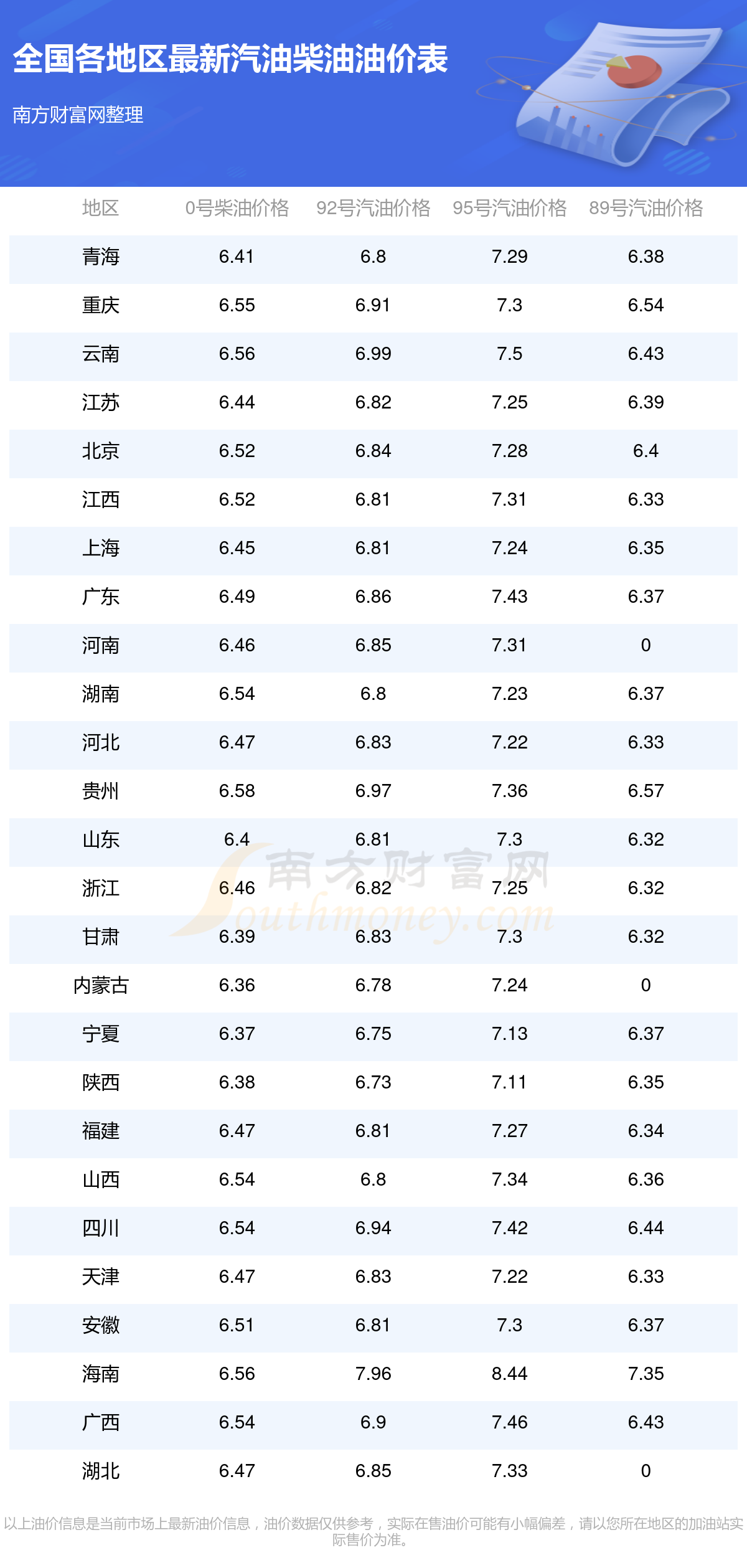 油價(jià)最新調(diào)整時(shí)間為10月28日 ,全國92號(hào)汽油最新平均價(jià)格為:7元每升,其中,最高為海南,價(jià)格為7.96元/升,最低為陜西,價(jià)格為6.73元/升。全國95號(hào)汽油最新平均價(jià)格為:7元每升,其中,最高為海南,價(jià)格為8.44元/升,最低為陜西,價(jià)格為7.11元/升。全國0號(hào)