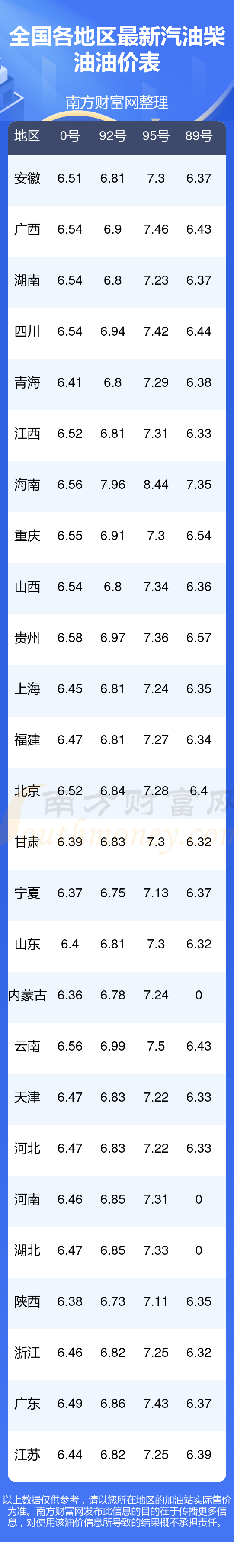以上數(shù)據(jù)僅供參考,請(qǐng)以您所在地區(qū)的加油站實(shí)際售價(jià)為準(zhǔn)。南方財(cái)富網(wǎng)發(fā)布此信息的目的在于傳播更多信息,對(duì)使用該油價(jià)信息所導(dǎo)致的結(jié)果概不承擔(dān)責(zé)任。