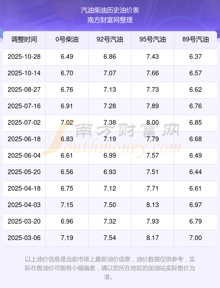 11月9日廣東肇慶汽油、柴油每升價格:距離最近的油價調(diào)整時間是10月28日,92號汽油為6.86元,降了0.21元,降幅達(dá)2.97%;95號汽油為7.43元,降了0.23元,降幅達(dá)3%;89號汽油為6.37元,降了0.2元,降幅達(dá)3.04%;0號柴油為6.49元,降了0.21元,降幅達(dá)3.13%。下一輪油價調(diào)整時間11月10日24時,距離現(xiàn)在還有1.33天。