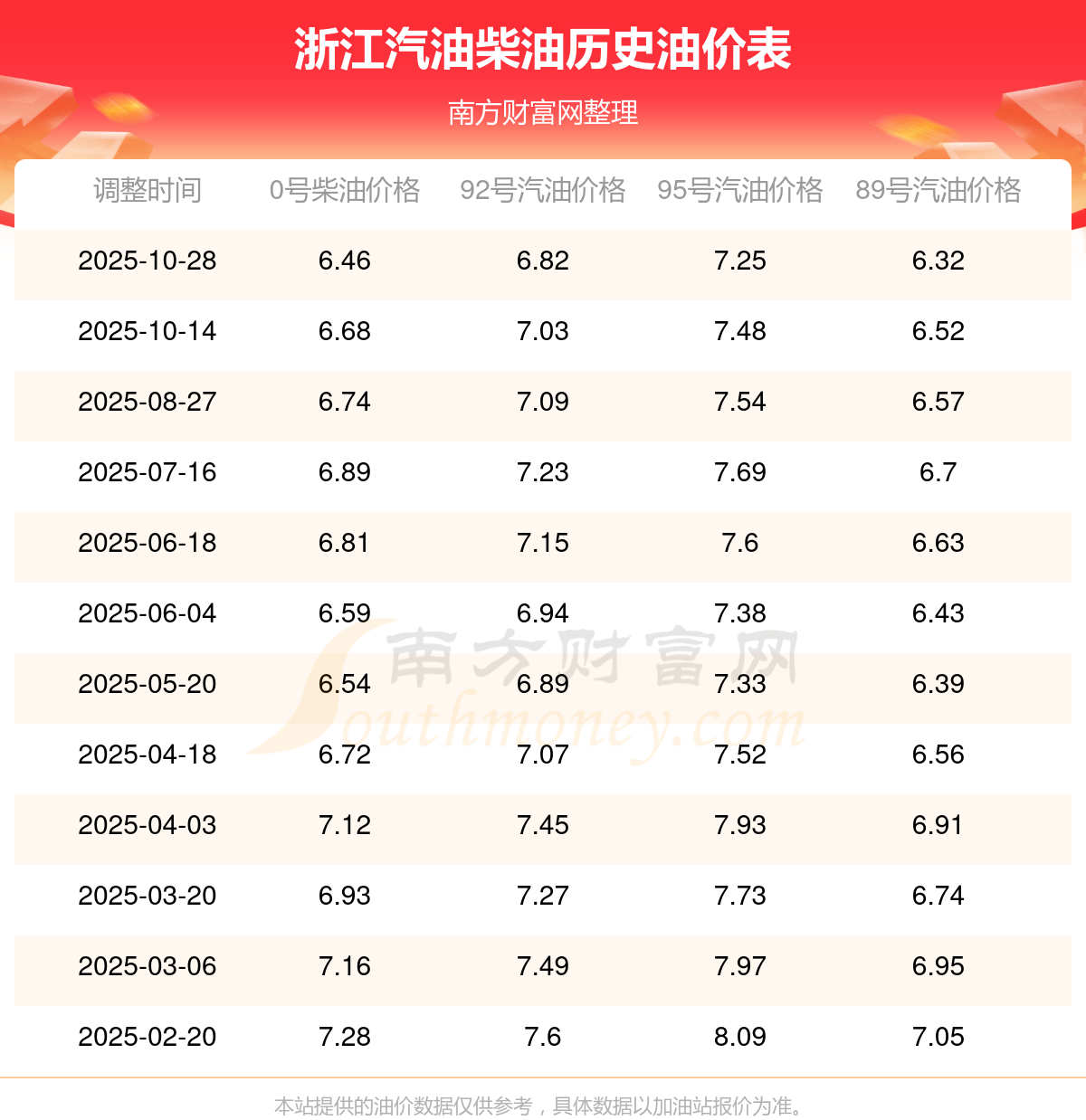 浙江89號汽油11月9日價格為6.32元/升,調(diào)整時間為10月28日,相對上次調(diào)整下調(diào)了0.2元。