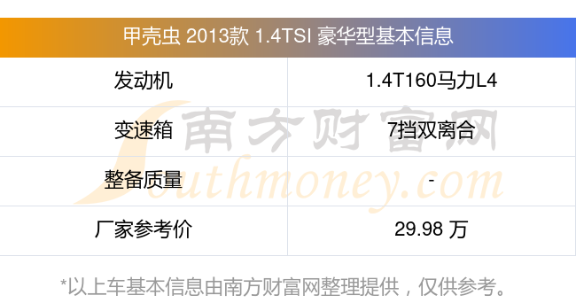 在動(dòng)力上,甲殼蟲(chóng) 2013款 1.4TSI 豪華型配備的是一臺(tái)1.4T160馬力L4機(jī)械+渦輪增壓發(fā)動(dòng)機(jī),匹配的是7擋雙離合自動(dòng)檔變速箱,燃料形式為汽油,廠家參考價(jià)29.98萬(wàn)元。