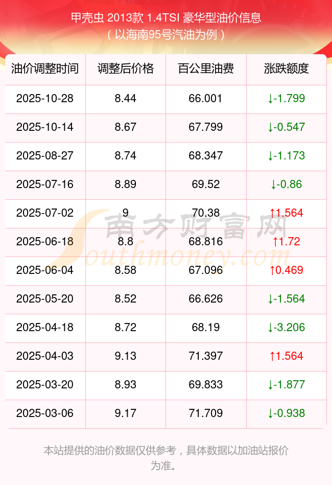 按10月28日95號(hào)汽油最新調(diào)整價(jià)格8.44元每升來(lái)計(jì)算(以海南為例),該車(chē)型百公里平均油費(fèi)為66.001元,按上一輪10月14日調(diào)整價(jià)格8.67元每升來(lái)計(jì)算,百公里平均油費(fèi)為67.799元,對(duì)比上一輪少花1.799元,下一輪油價(jià)調(diào)整時(shí)間為11月10日24時(shí)。