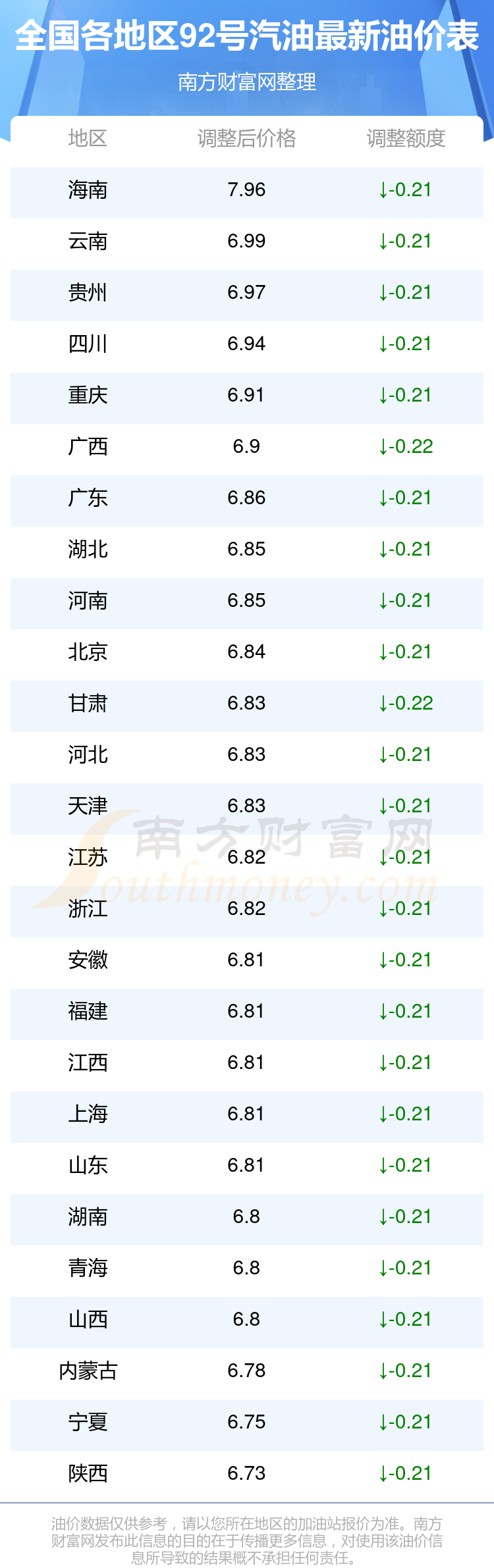 以上數(shù)據(jù)僅供參考,請以您所在地區(qū)的加油站實際售價為準。南方財富網(wǎng)發(fā)布此信息的目的在于傳播更多信息,對使用該油價信息所導致的結果概不承擔責任。