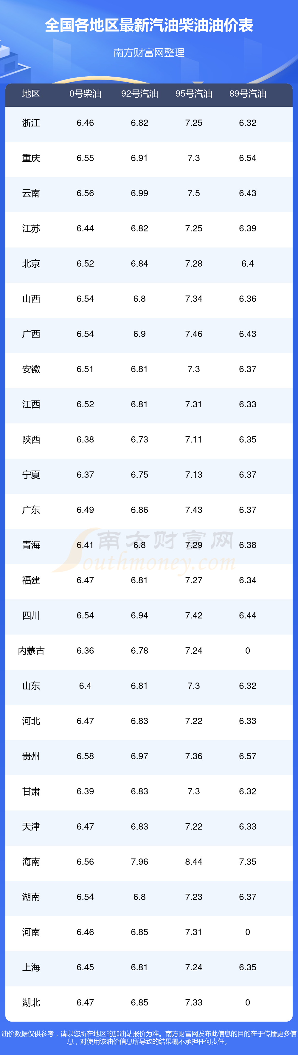 2025年11月9日全國各地汽油價(jià)格一覽表