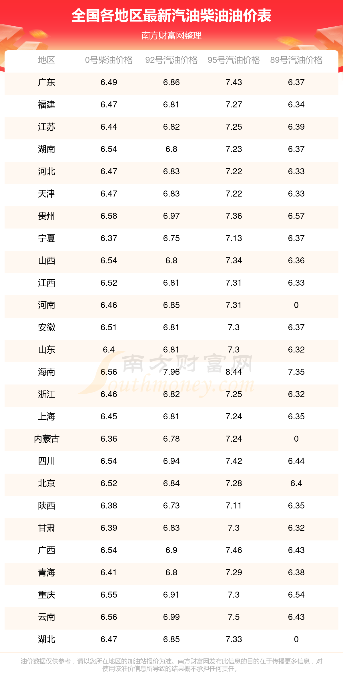 本輪油價的調(diào)整時間為10月28日,調(diào)整后全國92號汽油平均價格為7元每升,其中,最低為陜西的6.73元/升,最高為海南的7.96元/升。全國95號汽油平均價格為7元每升,其中,最低為陜西的7.11元/升,最高為海南的8.44元/升。全國0號柴油平均價格為:6元每升,其中