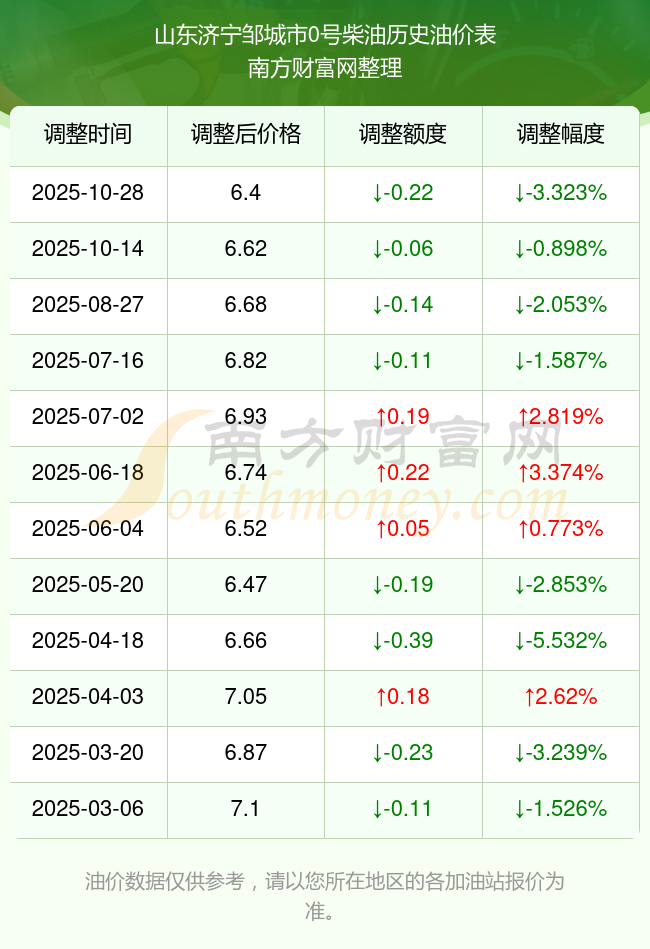 11月9日山東濟寧鄒城市0號柴油歷史油價一覽表