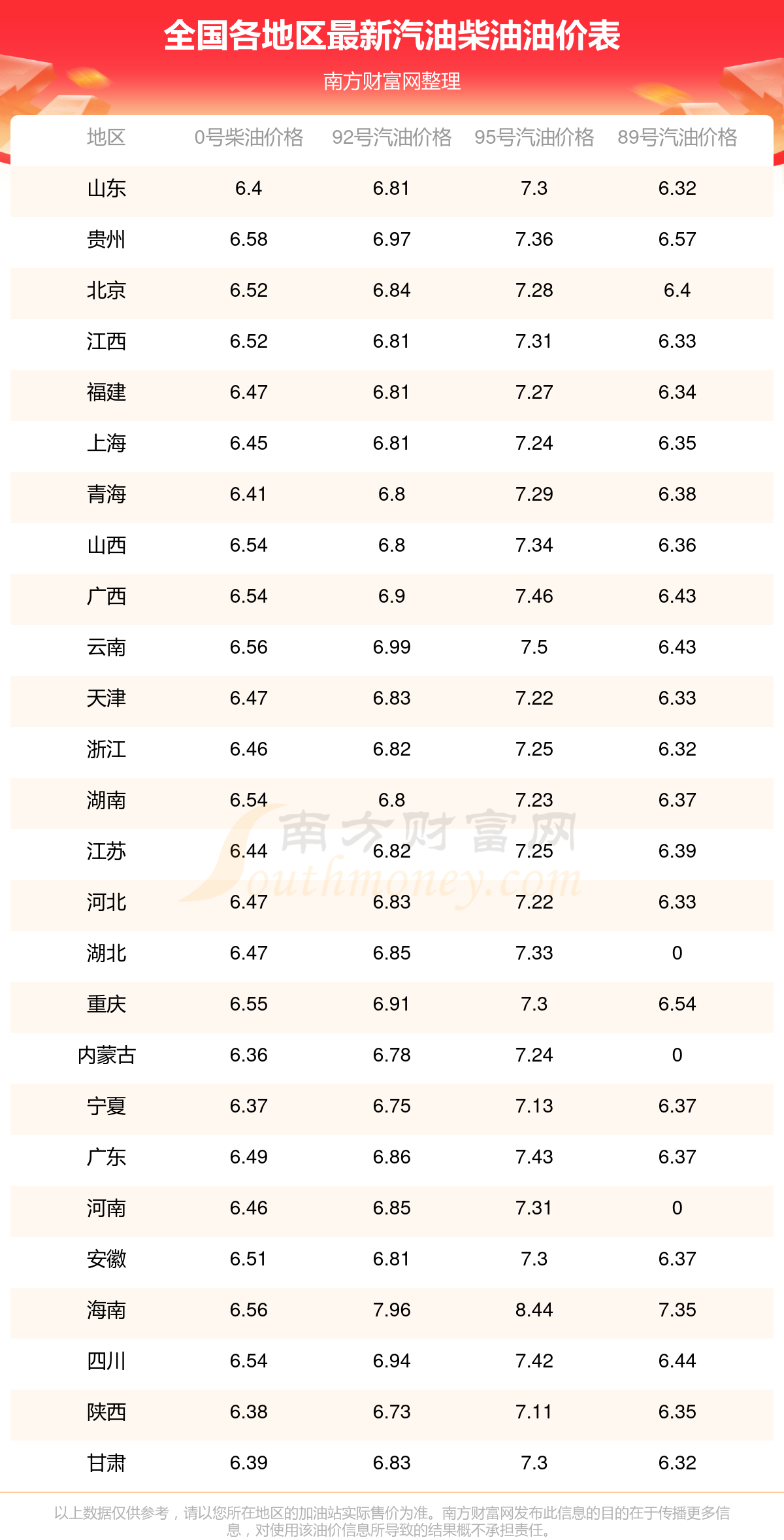 89號汽油平均價格:6元每升,其中,最高為海南,價格為7.35元/升,最低為浙江,價格為6.32元/升。