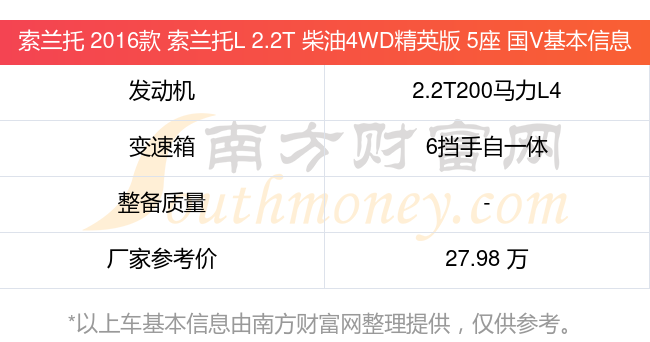 在動力方面,索蘭托 2016款 索蘭托L 2.2T 柴油4WD精英版 5座 國V搭載的是一臺2.2T200馬力L4渦輪增壓發(fā)動機(jī),匹配6擋手自一體自動檔變速箱,燃料形式為柴油,廠家參考價(jià)27.98萬元。
