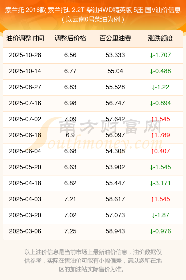 按10月28日0號柴油最新調(diào)整價(jià)格6.56元每升來計(jì)算(以云南為例),該車型百公里平均油費(fèi)為53.333元,按上一輪10月14日調(diào)整價(jià)格6.77元每升來計(jì)算,百公里平均油費(fèi)為55.04元,對比上一輪少花1.707元,下一輪油價(jià)調(diào)整時(shí)間為11月10日24時(shí)。