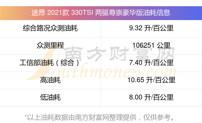 根據(jù)多位車主實(shí)測(cè)得出數(shù)據(jù),該車型低油耗為8.00升/百公里,高油耗為10.65升/百公里,綜合路況眾測(cè)油耗為9.32升/百公里,工信部綜合油耗為7.40升/百公里。