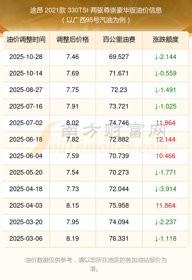 途昂 2021款 330TSI 兩驅(qū)尊崇豪華版每公里耗油量多少錢?11月9日油價(jià)92、95號(hào)汽油價(jià)格查詢