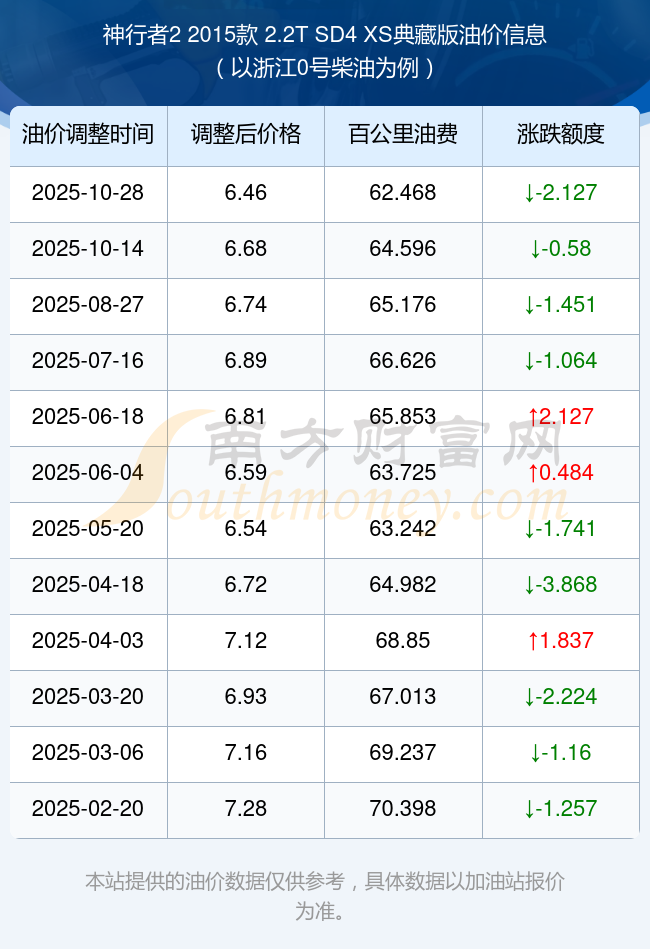 根據(jù)10月28日0號柴油最新調(diào)整價格6.46元/升來計(jì)算(以浙江為例),該車型每百公里的平均油費(fèi)是62.468元,上一輪10月14日調(diào)整價格6.68元每升來計(jì)算,每百公里的平均油費(fèi)是64.596元,對比上一輪少花2.127元,下一輪的油價調(diào)整時間是11月10日24時。