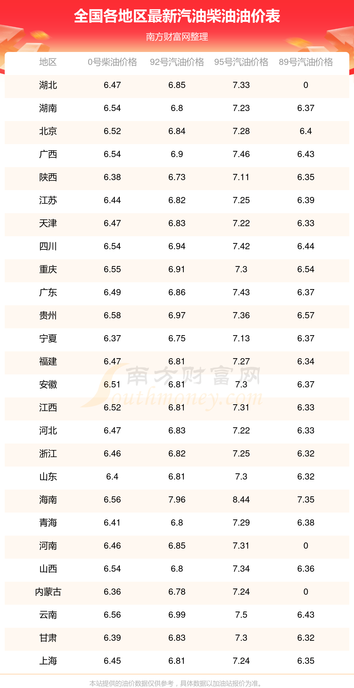 以上油價(jià)信息是當(dāng)前市場(chǎng)上最新油價(jià)信息,油價(jià)數(shù)據(jù)僅供參考,實(shí)際在售油價(jià)可能有小幅偏差,請(qǐng)以您所在地區(qū)的加油站實(shí)際售價(jià)為準(zhǔn)。