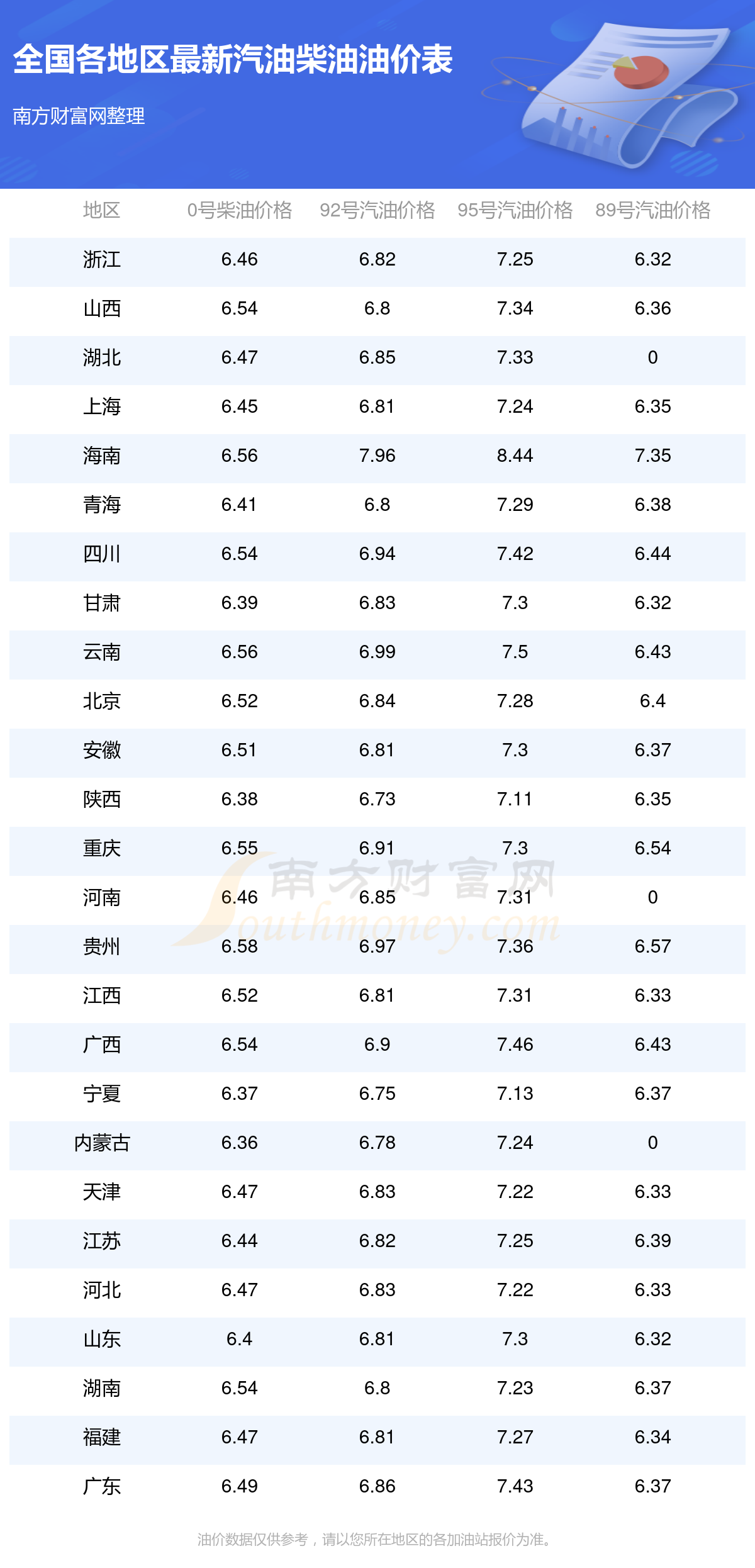 以上數(shù)據(jù)僅供參考,請以您所在地區(qū)的加油站實際售價為準。南方財富網(wǎng)發(fā)布此信息的目的在于傳播更多信息,對使用該油價信息所導致的結(jié)果概不承擔責任。