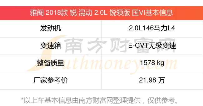 雅閣 2018款 銳·混動(dòng) 2.0L 銳領(lǐng)版 國(guó)VI動(dòng)力方面,搭載的是一臺(tái)2.0L146馬力L4自然吸氣發(fā)動(dòng)機(jī),匹配E-CVT無(wú)級(jí)變速自動(dòng)檔變速箱,燃料形式為油電混合,常規(guī)整備質(zhì)量1578kg,廠家參考價(jià)21.98萬(wàn)元。