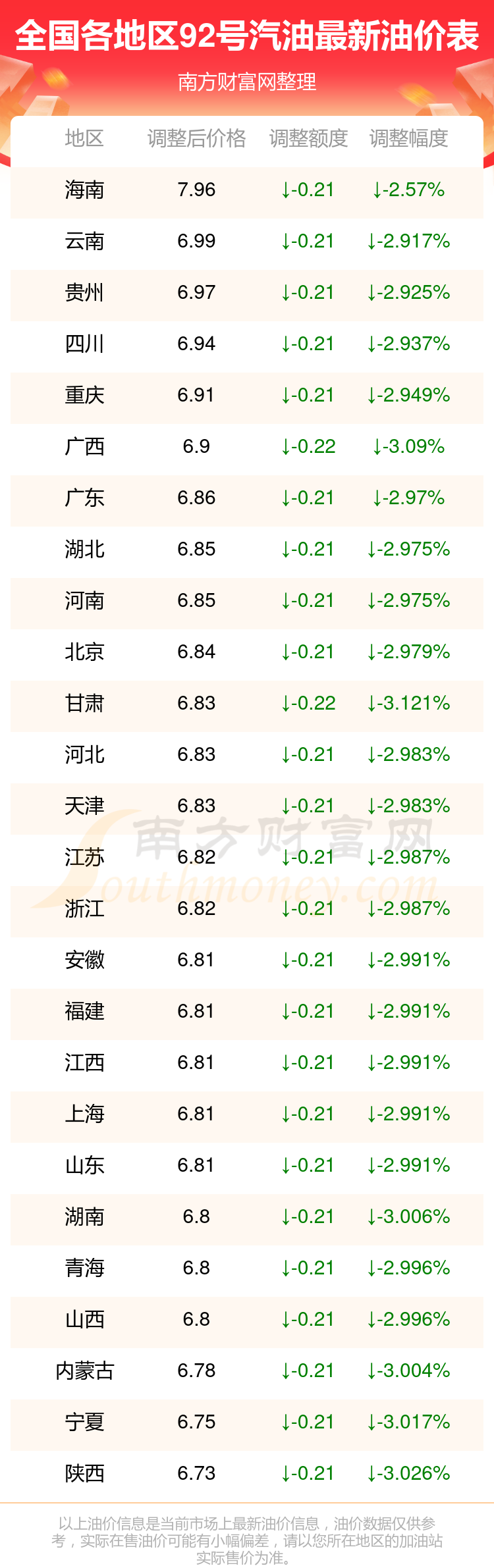 全國92號汽油平均價格為:7元每升,其中,最低為陜西,價格6.73元/升,最高為海南,價格7.96元/升。