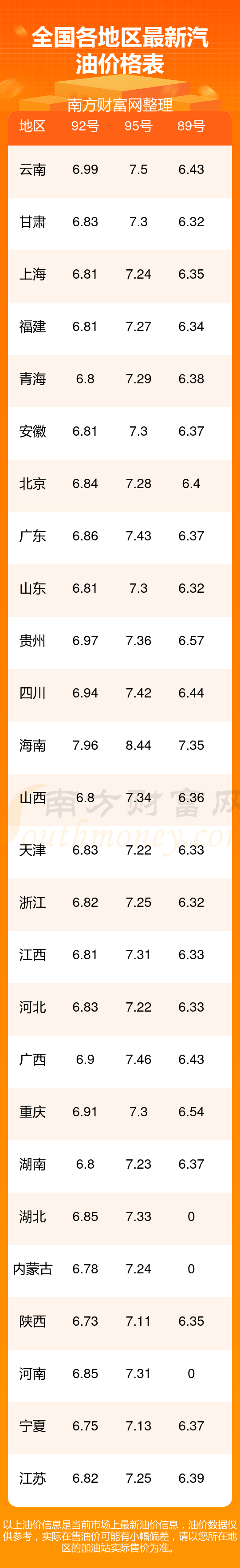 全國92號汽油最新平均價格為:7元每升,其中,最高為海南,價格為7.96元/升,最低為陜西,價格為6.73元/升。