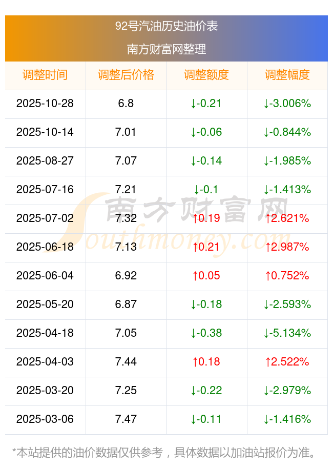 油價調(diào)整最新消息:下一輪油價調(diào)整時間11月10日24時。11月9日湖南汽油、柴油油價:本輪油價調(diào)整時間是10月28日,92號汽油6.8元,下調(diào)了0.21元,下調(diào)幅達(dá)3.01%;95號汽油7.23元,下調(diào)了0.22元,下調(diào)幅達(dá)3.01%;89號汽油6.37元,下調(diào)了0.2元,下調(diào)幅達(dá)3.01%;0號柴油6.54元,下調(diào)了0.22元,下調(diào)幅達(dá)3.26%。