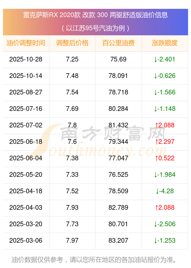 按10月28日95號(hào)汽油最新調(diào)整價(jià)格7.25元每升來(lái)計(jì)算(以江蘇為例),該車(chē)型百公里平均油費(fèi)為75.69元,按上一輪10月14日調(diào)整價(jià)格7.48元每升來(lái)計(jì)算,百公里平均油費(fèi)為78.091元,對(duì)比上一輪少花2.401元,下一輪油價(jià)調(diào)整時(shí)間為11月10日24時(shí)。