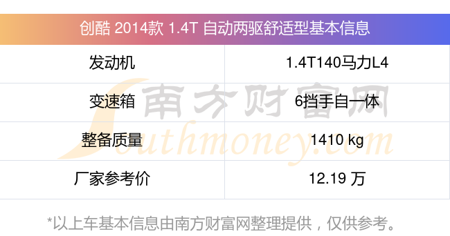 創(chuàng)酷 2014款 1.4T 自動(dòng)兩驅(qū)舒適型動(dòng)力上配備的是一臺(tái)1.4T140馬力L4渦輪增壓發(fā)動(dòng)機(jī),匹配的是6擋手自一體自動(dòng)檔變速箱,燃料形式為汽油,常規(guī)整備質(zhì)量1410kg,廠家參考價(jià)12.19萬(wàn)元。