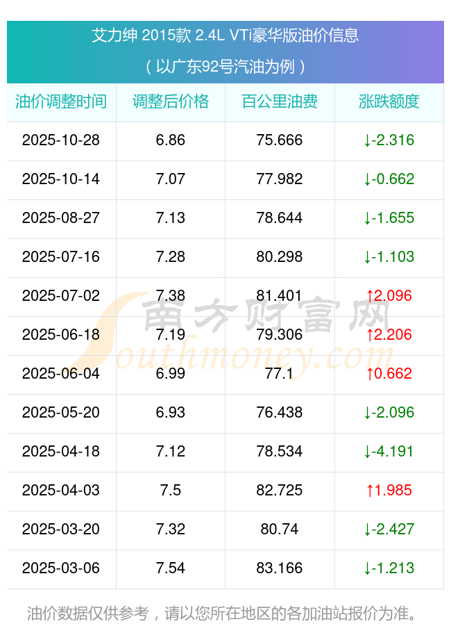 按10月28日92號汽油最新調(diào)整價格6.86元每升來計算(以廣東為例),該車型百公里平均油費為75.666元,按上一輪10月14日調(diào)整價格7.07元每升來計算,百公里平均油費為77.982元,對比上一輪少花2.316元,下一輪油價調(diào)整時間為11月10日24時。