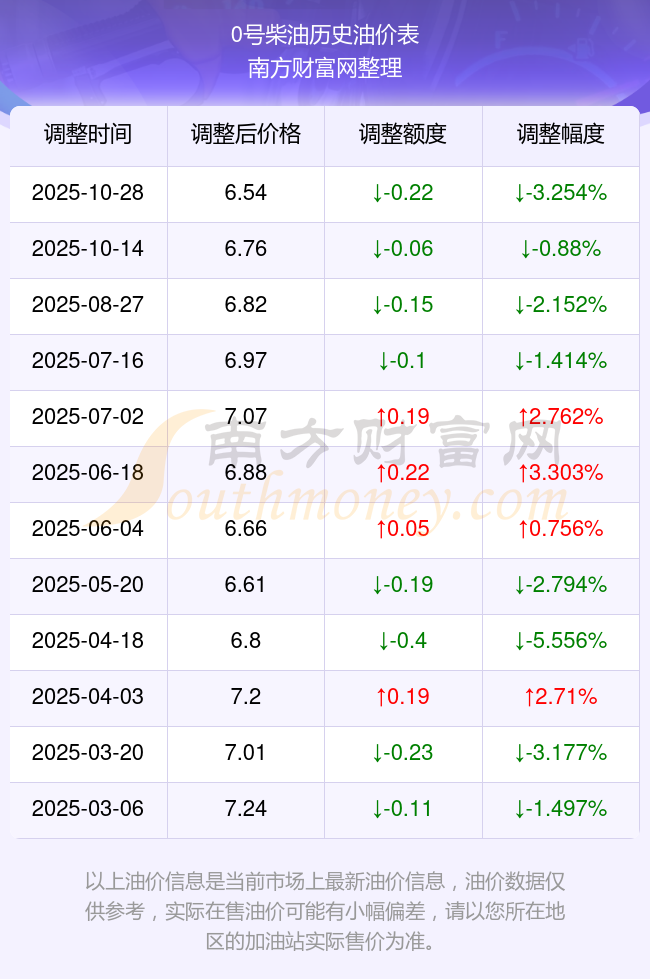 11月10日江蘇汽油、柴油油價:本輪油價調(diào)整時間是10月28日,92號汽油6.82元,跌了0.21元,跌幅達2.99%;95號汽油7.25元,跌了0.23元,跌幅達3.08%;89號汽油6.39元,跌了0.2元,跌幅達3.04%;0號柴油6.44元,跌了0.22元,跌幅達3.3%。 江蘇2025年最新汽油柴