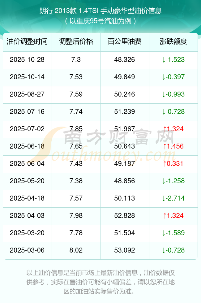 依照10月28日95號汽油最新調整價格7.3元/升來計算(以重慶為例),該車型百公里的平均油費是48.326元,依照上一輪10月14日調整價格7.53元/升來計算,百公里的平均油費是49.849元,對比上一輪少花1.523元,下一輪的油價調整時間11月10日24時。