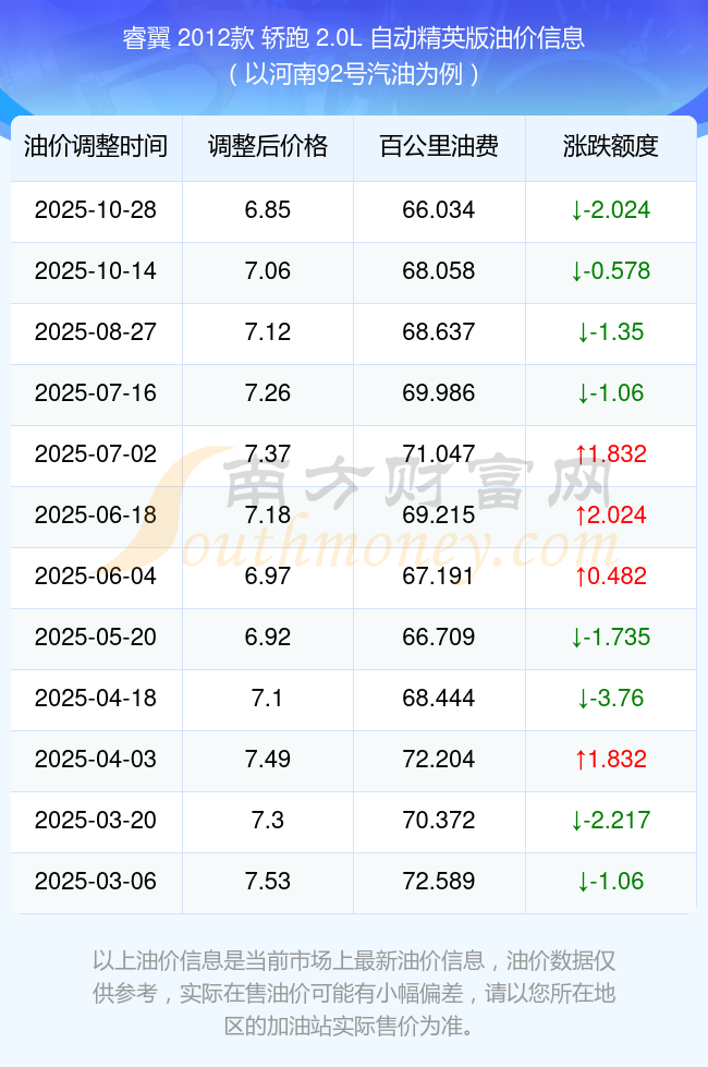11月10日福建汽油、柴油每升的價(jià)格為10月28日調(diào)整后的價(jià)格,92號(hào)汽油為6.81元,降了0.21元,降幅達(dá)2.99%;95號(hào)汽油為7.27元,降了0.23元,降幅達(dá)3.07%;89號(hào)汽油為6.34元,降了0.2元,降幅達(dá)3.06%;0號(hào)柴油為6.47元,降了0.22元,降幅達(dá)3.29%。 2025年油價(jià)調(diào)