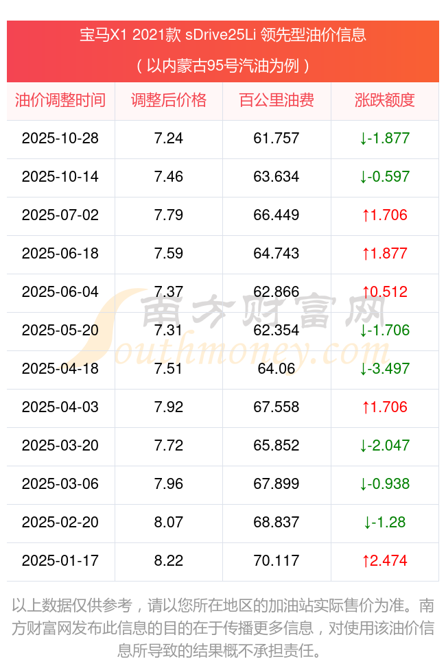 根據(jù)10月28日95號(hào)汽油最新調(diào)整價(jià)格7.24元/升來(lái)計(jì)算(以內(nèi)蒙古為例),該車型每百公里的平均油費(fèi)是61.757元,上一輪10月14日調(diào)整價(jià)格7.46元每升來(lái)計(jì)算,每百公里的平均油費(fèi)是63.634元,對(duì)比上一輪少花1.877元,下一輪的油價(jià)調(diào)整時(shí)間是11月10日24時(shí)。