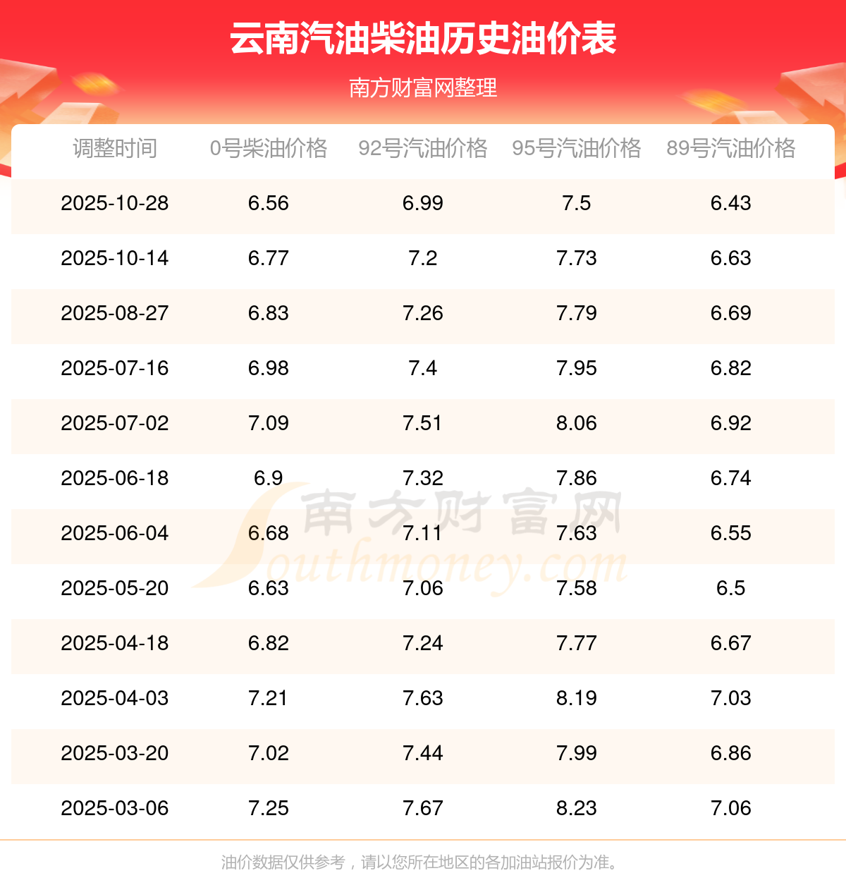 2025年云南汽油價格一覽表