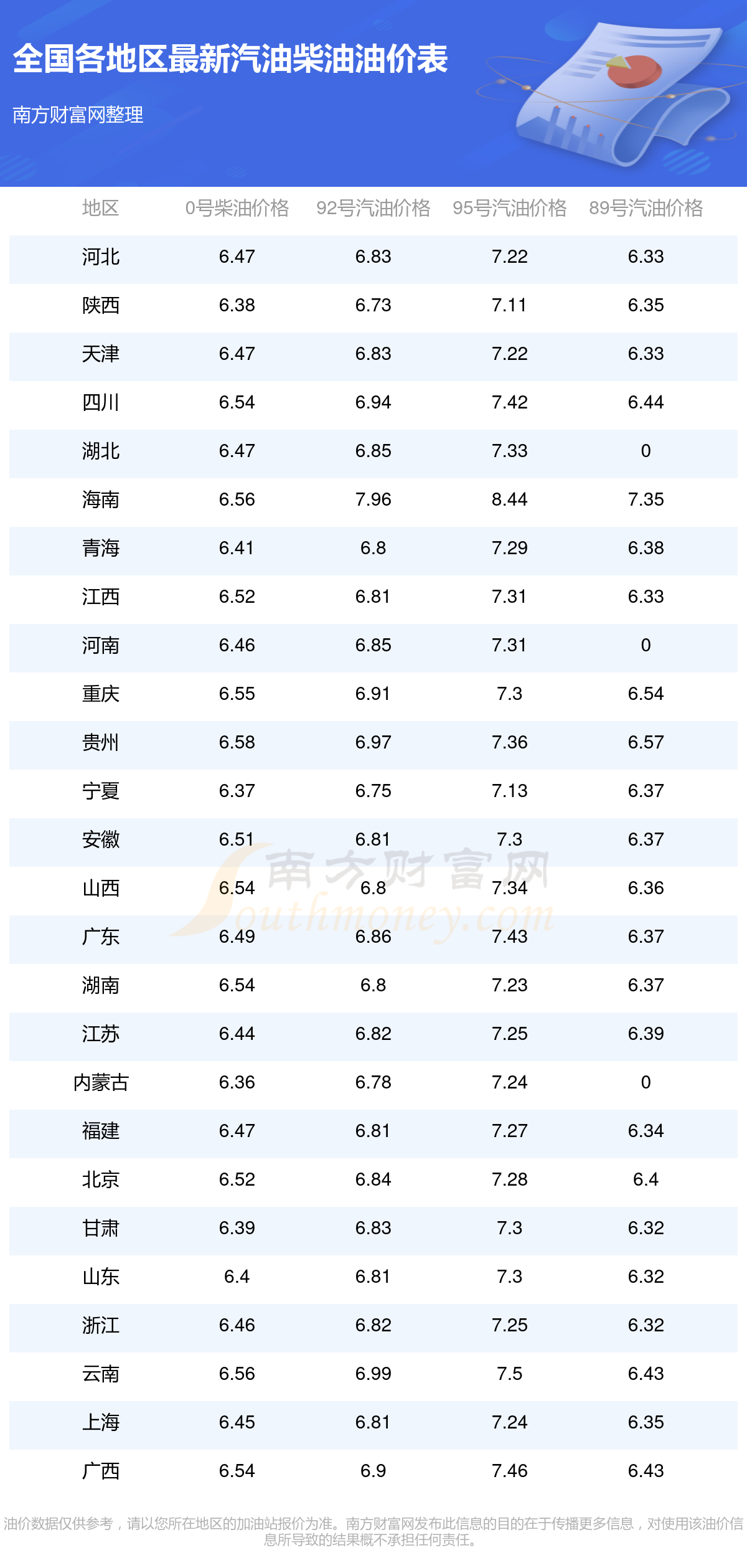 95號汽油平均價格:7元每升,其中,最高為海南,價格8.44元/升,最低為陜西,價格7.11元/升。
