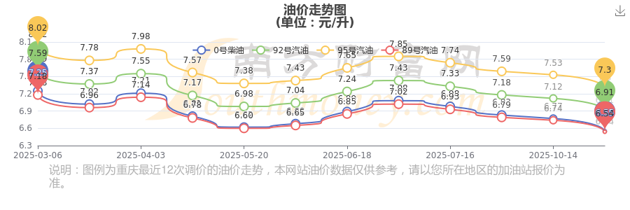 重慶豐都95號汽油11月10日的最新價格(10月28日油價調(diào)整后的價格):重慶豐都95號汽油7.3元/升,相對上次調(diào)整時間10月14日的油價7.53元每升,下跌了0.23元,下跌3.054%。下一輪油價調(diào)整時間11月10日24時,距離現(xiàn)在還有0.68天。