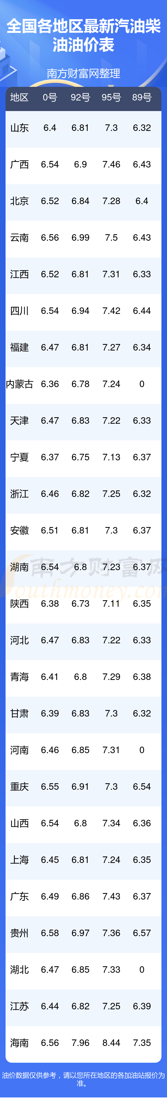 油價最新調整時間為10月28日 ,全國92號汽油最新平均價格為:7元每升,其中,最高為海南,價格為7.96元/升,最低為陜西,價格為6.73元/升。全國95號汽油最新平均價格為:7元每升,其中,最高為海南,價格為8.44元/升,最低為陜西,價格為7.11元/升。全國0號柴油最新平均價格為:6元每升,其中,最高為貴州,價格為6.58元/升,最低為內蒙古,價格為6.36元/升。全國89號汽油最新平均價格為:6元每升,其中,最高為海南,價格為7.35元/升,最低為浙江,價格為6.32元/升。,下一輪油價調整時間11月10日24時,距離現在還有0.68天。