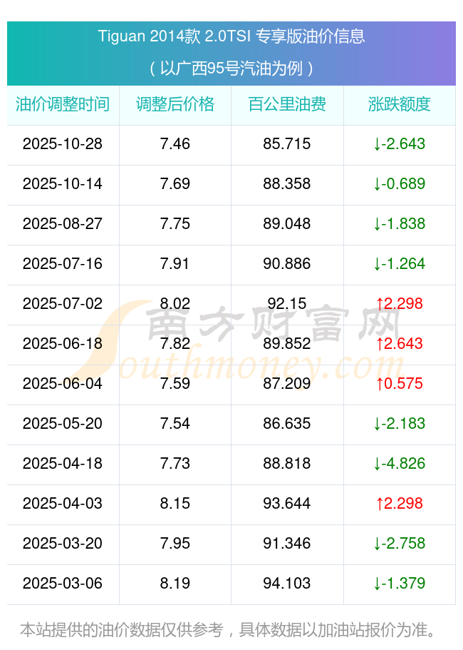 按照10月28日95號(hào)汽油最新調(diào)整價(jià)格7.46元/升來(lái)計(jì)算(以廣西為例),該車(chē)型百公里平均油費(fèi)為85.715元,按照上一輪10月14日調(diào)整價(jià)格7.69元/升來(lái)計(jì)算,百公里平均油費(fèi)為88.358元,對(duì)比上一輪少花2.643元,下一輪油價(jià)調(diào)整時(shí)間為11月10日24時(shí)。