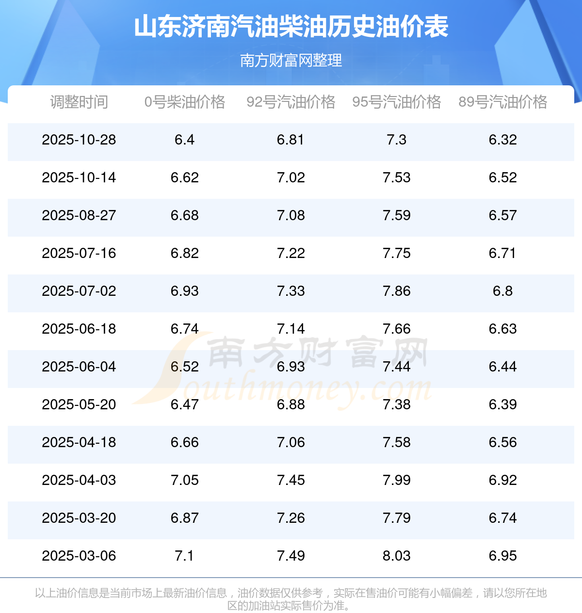 油價調(diào)整最新消息:11月10日,山東濟南汽油、柴油每升最新價格:本輪的油價調(diào)整時間是10月28日,92號汽油為6.81元,下調(diào)了0.21元,下調(diào)幅達2.99%;95號汽油為7.3元,下調(diào)了0.23元,下調(diào)幅達3.05%;89號汽油為6.32元,下調(diào)了0.2元,下調(diào)幅達3.07%;0號柴油為6.4元,下調(diào)了0.22元,下調(diào)幅達3.32%。山東濟南下一輪油價調(diào)整時間11月10日24時,距離現(xiàn)在還有0.63天。