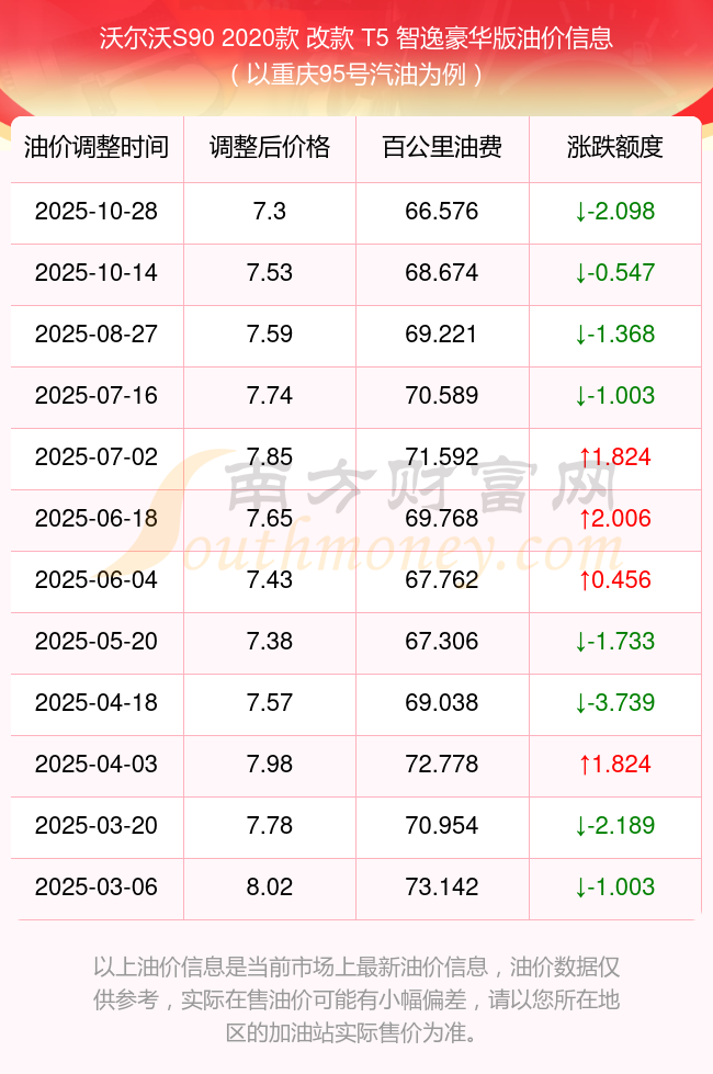 按10月28日95號汽油最新調(diào)整價格7.3元每升來計算(以重慶為例),該車型百公里平均油費為66.576元,按上一輪10月14日調(diào)整價格7.53元每升來計算,百公里平均油費為68.674元,對比上一輪少花2.098元,下一輪油價調(diào)整時間為11月10日24時。