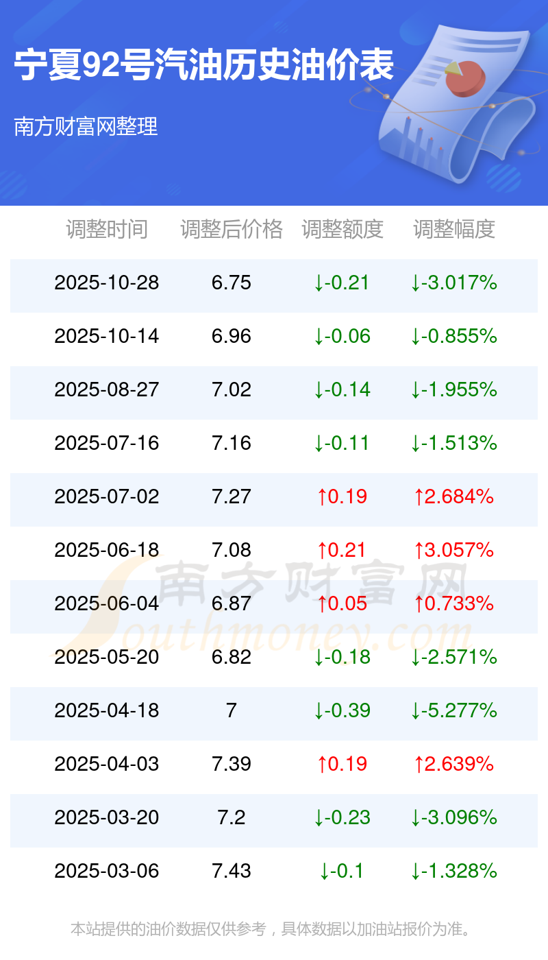 11月10日,寧夏92號(hào)汽油的價(jià)格是6.75元每升,本次的調(diào)整時(shí)間為10月28日,對(duì)比上次的調(diào)整跌了0.21元,跌3.017%,下次調(diào)整時(shí)間為11月10日24時(shí),還有0.61天。
