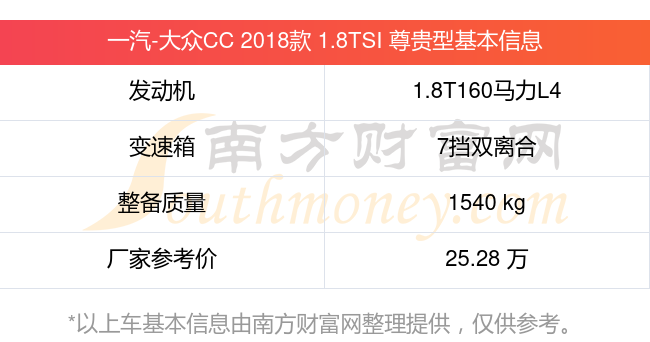 一汽-大眾CC 2018款 1.8TSI 尊貴型動力方面,搭載的是一臺1.8T160馬力L4渦輪增壓發(fā)動機(jī),匹配7擋雙離合自動檔變速箱,燃料形式為汽油,常規(guī)整備質(zhì)量1540kg,廠家參考價25.28萬元。
